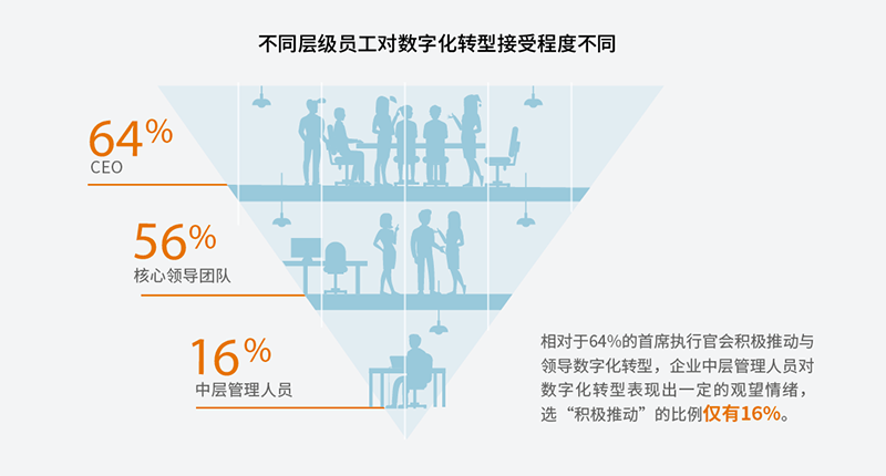 另一个值得注意的发现是,随着负责的领导者职位的下降,员工对数字化的支持度随之降低。企业的首席执行官对数字化转型的认可程度最高,64%的受访企业中,首席执行官成为数字化转型的“持续有助于者”,而涉及到中层管理和一线员工时,这一数字则急剧下降至16%和12%(选“持续有助于”的比例显著低于CEO和核心领导班子)。传统非数字化企业的中层管理人员存在着明显的“组织惰性”,再次证明“自上而下”有助于转型的重要性,中层管理人员的“观望”态度有可能严重阻碍计划的执行,所以首席执行官的承诺和参与程度,是企业在数字化方面能否取得成功的一个最重要的预测性指标。